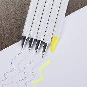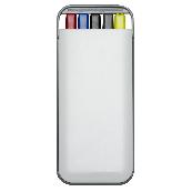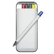 Descrição: Kit 5 em 1 branco em estojo plástico, contém canetas com as cargas: azul, preto e vermelho; marca texto amarelo e lapiseira.